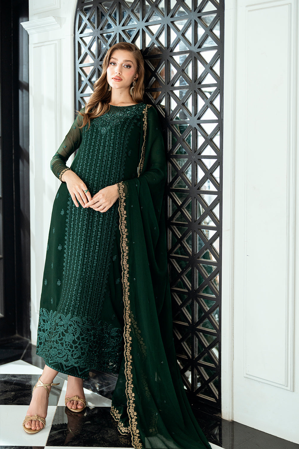This regal dark green chiffon ensemble, perfect for festive elegance. The delicately hand-embellished neckline adds a touch of luxury, while the flowing chiffon dupatta and tailored trousers complete the sophisticated look. This 3-piece outfit is an ideal choice for a graceful and timeless Eid ensemble.