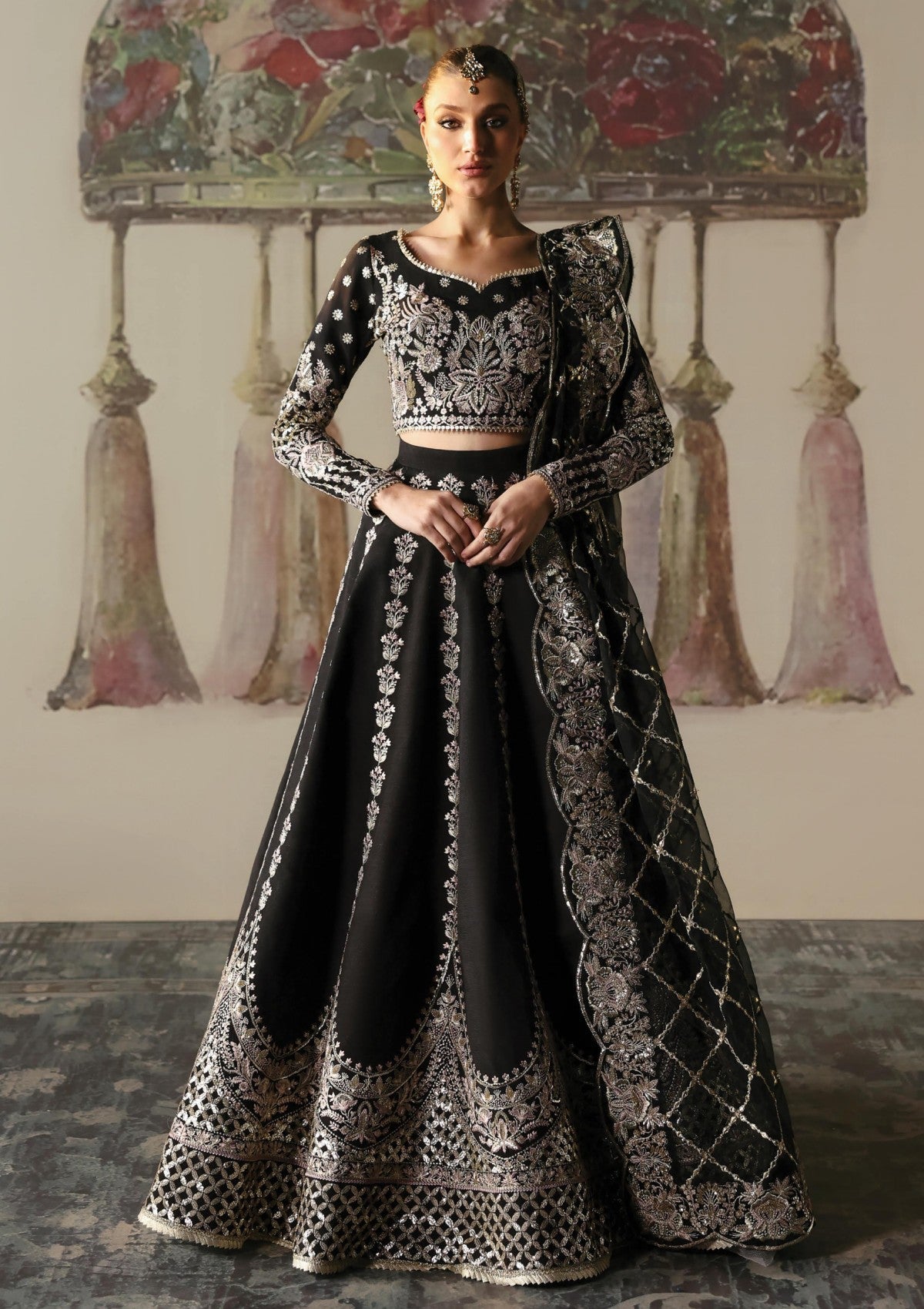 Captivating black lehenga choli is crafted from luxurious raw silk, exuding timeless elegance. The choli features intricate embroidery on the front body, complemented by a delicately embroidered back motif. The sleeves are adorned with a jaal-inspired embroidery, enhancing the traditional charm. The lehenga is elevated by golden panni, black thread detailing, light gold tilla work, and shimmering sequins. Paired with a sheer organza dupatta, adds a regal touch, making this lehenga choli perfect for grand celebrations and festive occasions.